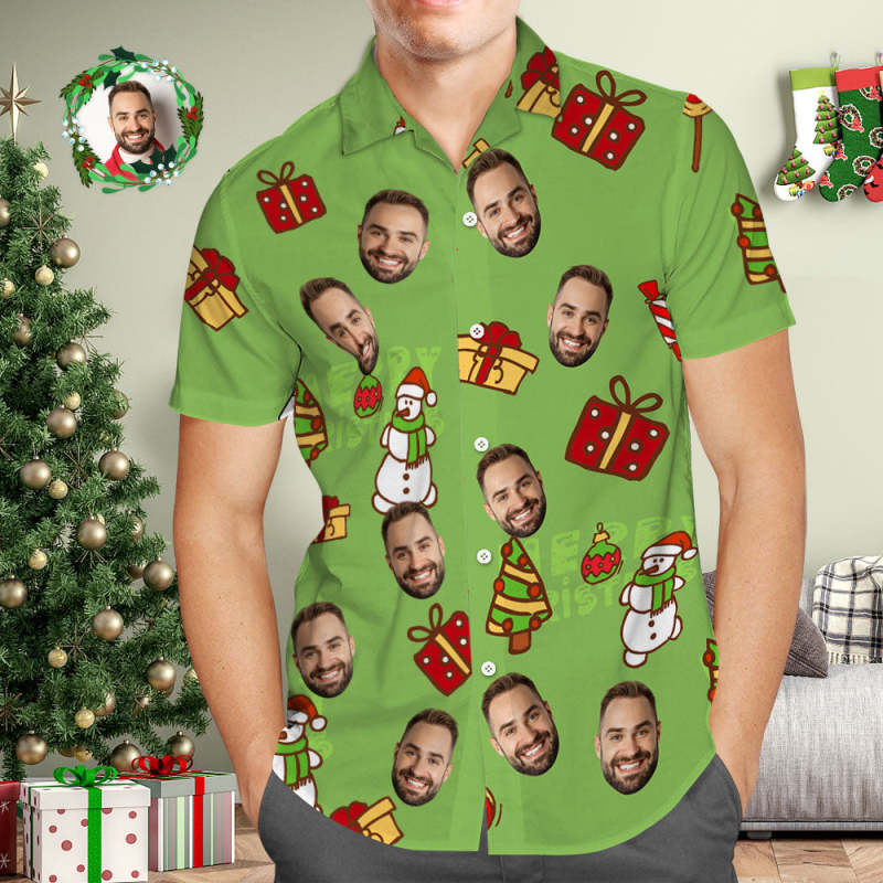 Chemise Hawaïenne Avec Visage Personnalisé, Photo Personnalisée, Chemises Hawaïennes Vertes, Bonhomme De Neige Et Cadeau De Noël Pour Lui