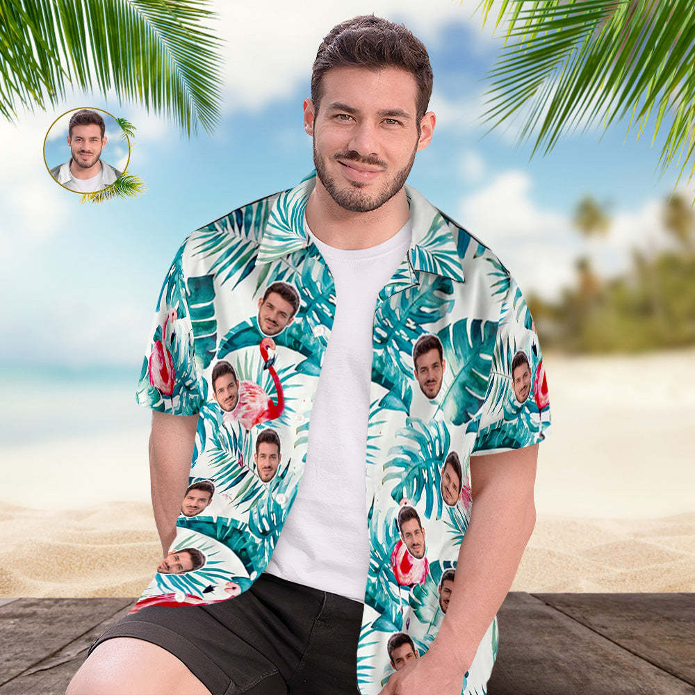 Chemise Hawaïenne Visage Personnalisé Été Flamant Rose Feuilles Visage Chemise Hawaïenne