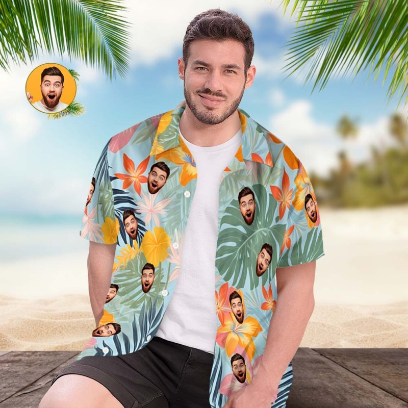 Chemises Hawaïennes Avec Visage Personnalisé, Fleurs Et Feuilles Colorées, Chemise Hawaïenne