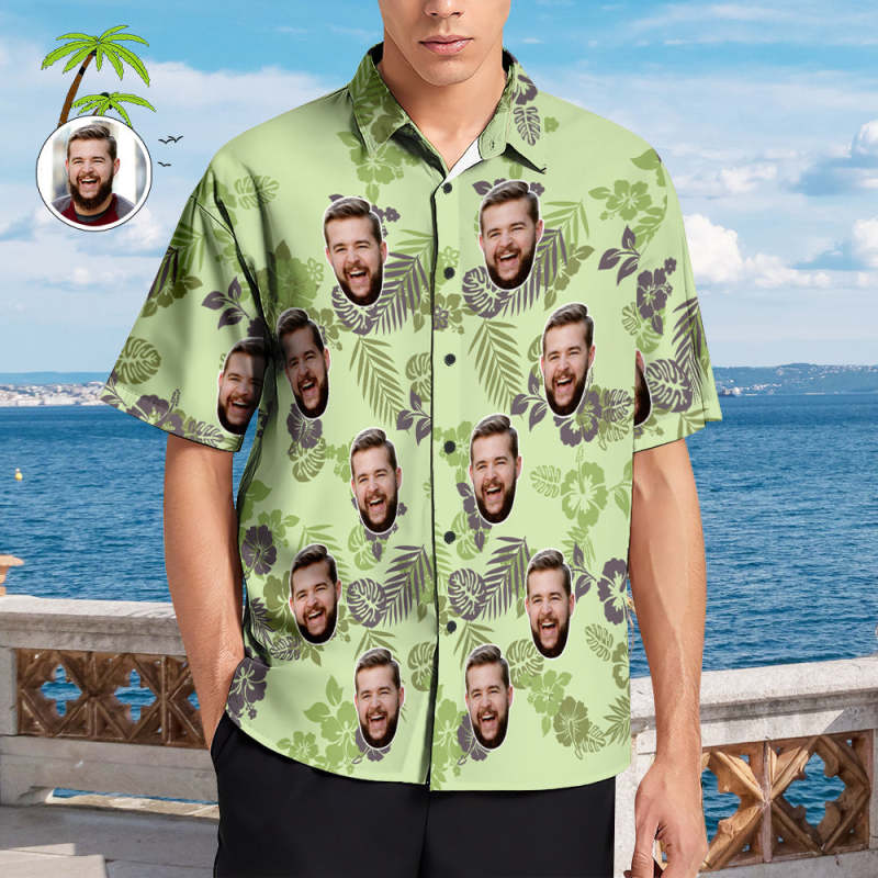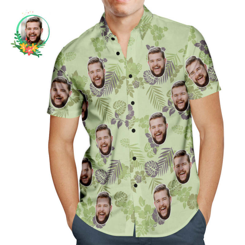 Visage Personnalisé Imprimé Feuilles Florales D'hibiscus Pour Hommes Chemise Hawaïenne Verte