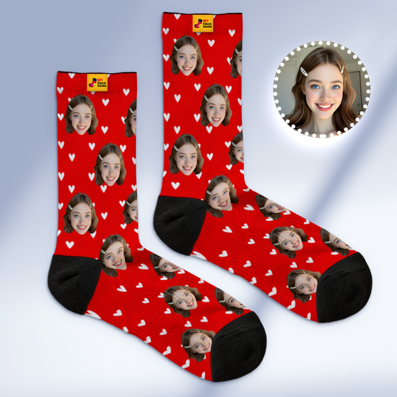 Chaussettes Personnalisées En Forme De Cœur, Chaussettes Rouges Personnalisées Avec Photo De Visages, Cadeau Amusant, Photo De Couple, Chaussettes De Famille