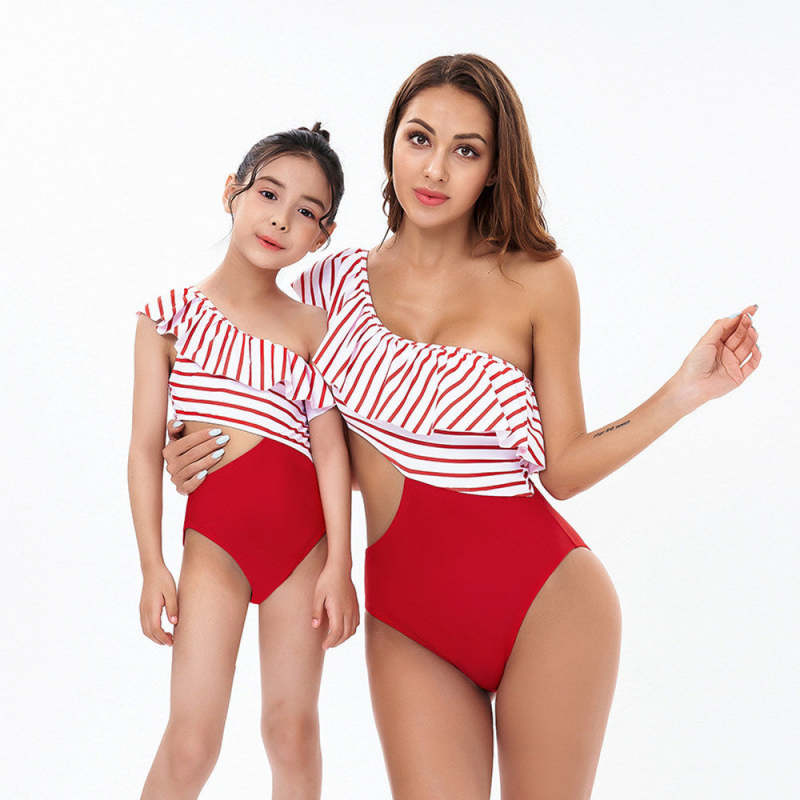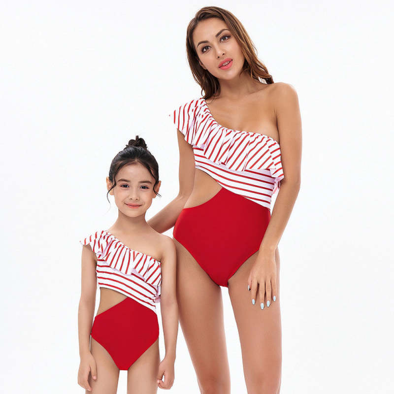 Bikini À Taille Haute Ébouriffé Rayé Maillot De Bain Parent-Enfant