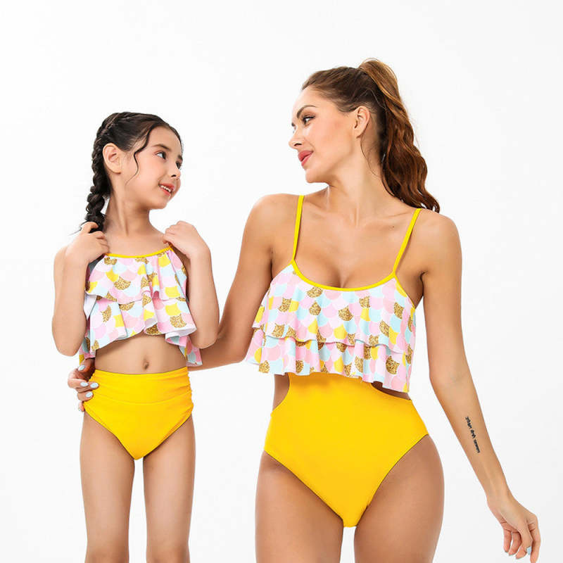 Bikini Taille Haute Écharpe Ébouriffé Impression D'écailles De Poisson Maillot De Bain Parent-Enfant