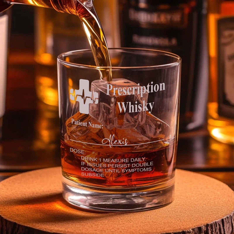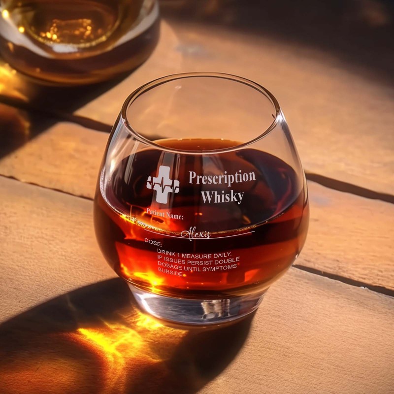 [VERRES À WHISKY PERSONNALISABLES] : Choisissez parmi trois styles de verres distincts : verre à whisky, petit verre tallo ou petit verre Tondo - et personnalisez-les avec une étiquette gravée « Prescription » et le nom de votre destinataire pour une touche unique et humoristique.