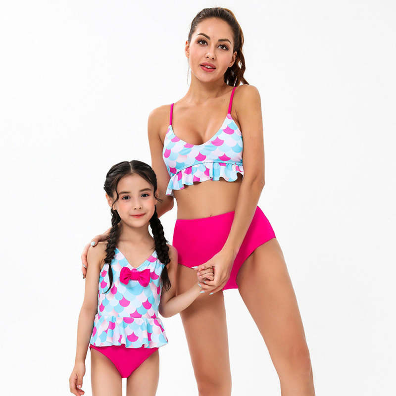 Bretelles Impression D'écailles De Poisson Taille Haute Fendue Maillot De Bain Parent-Enfant